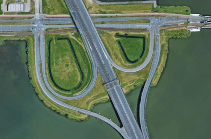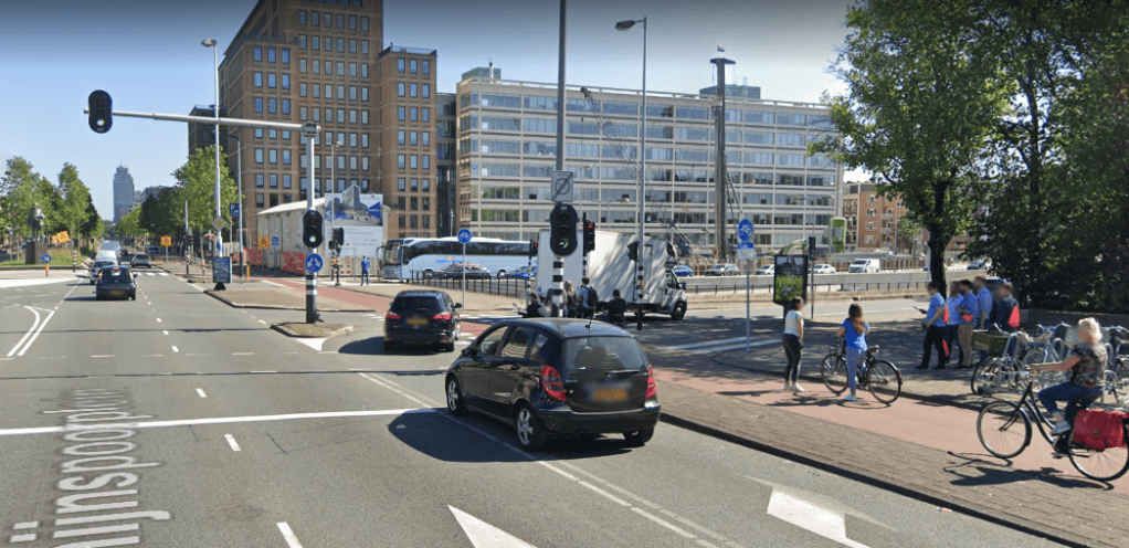 The same interchange viewed at street level. Notice the iconic red Dutch bicycle path adjacent to a sidewalk bypassing the intersection on the right. Source: Google Maps