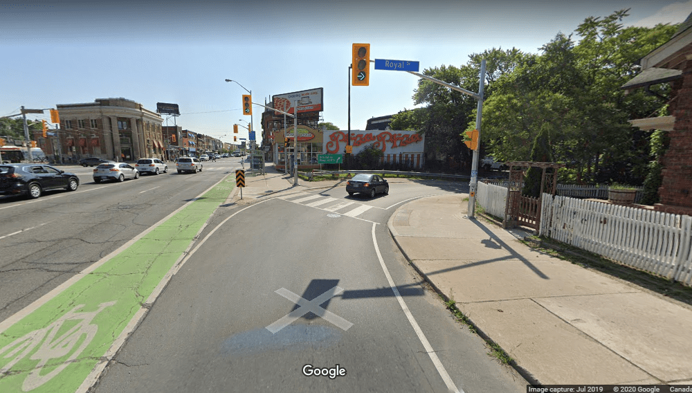 A freeway crossing in Toronto where pedestrians traveling in either direction must cross three free-flow ramps and two traffic signals. Source: Google Maps