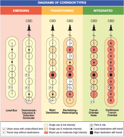 A 2017 academic study in the US compared and classified transit corridors with varying levels of development around each station. On the left are emerging transit corridors: those that that are almost entirely focused on the downtown commuter. Stations are surrounded by single-use, sprawled development, with lots of park-and-rides. On the other side, the integrated corridors feature high-intensity, mixed-use development around every station with very limited parking around stations.