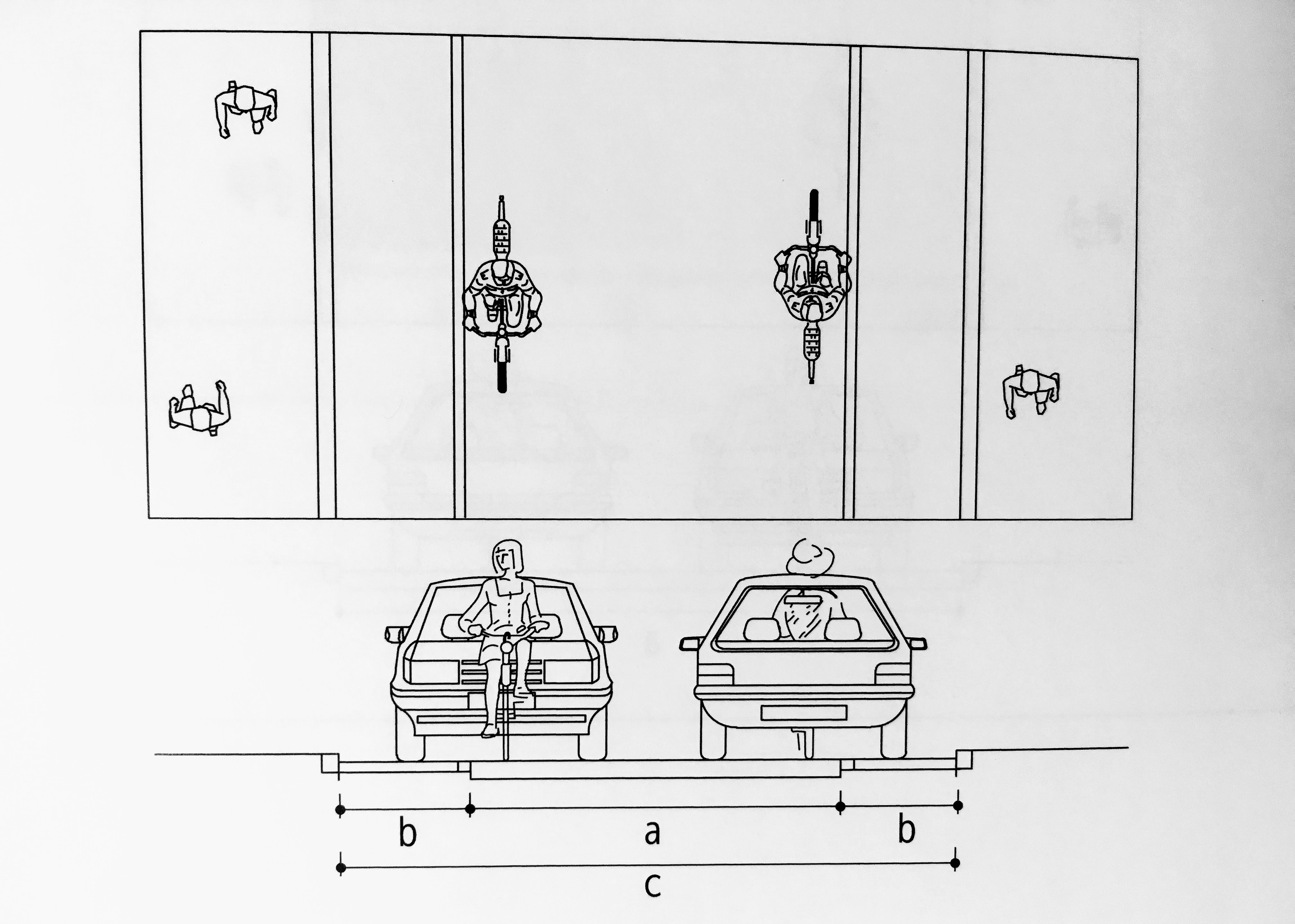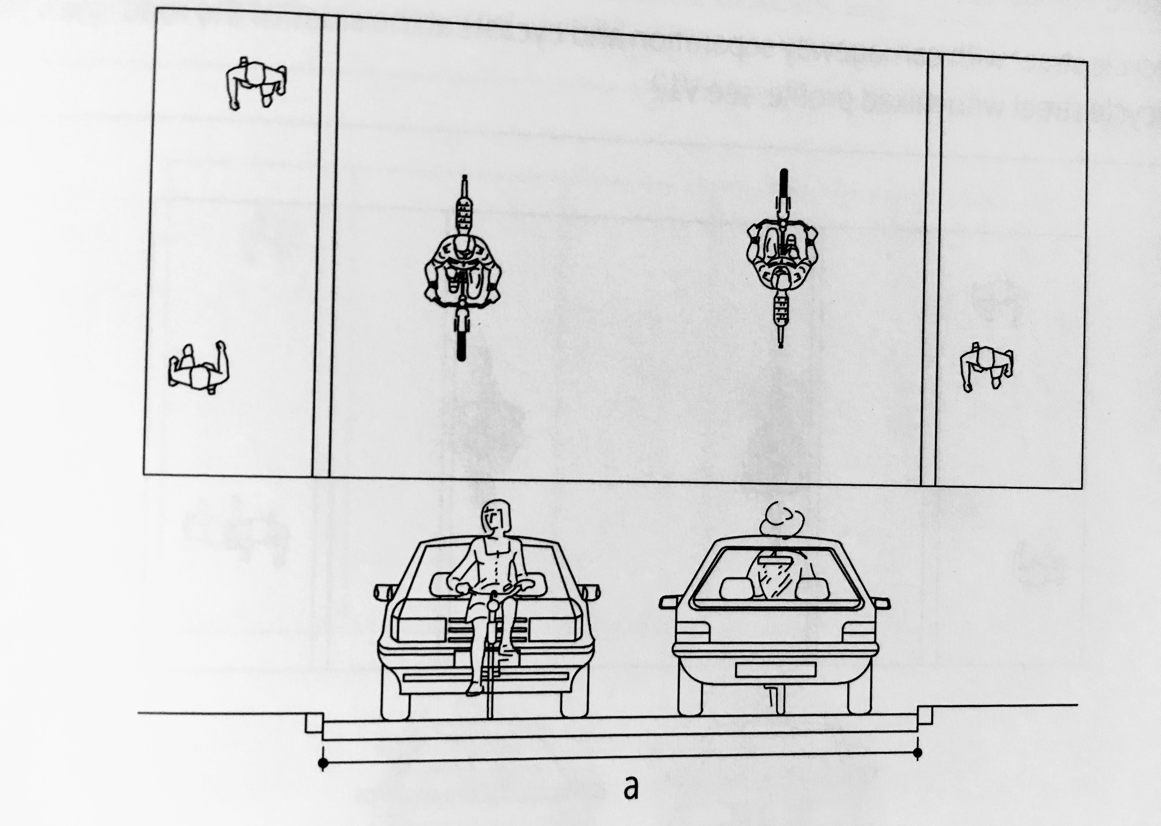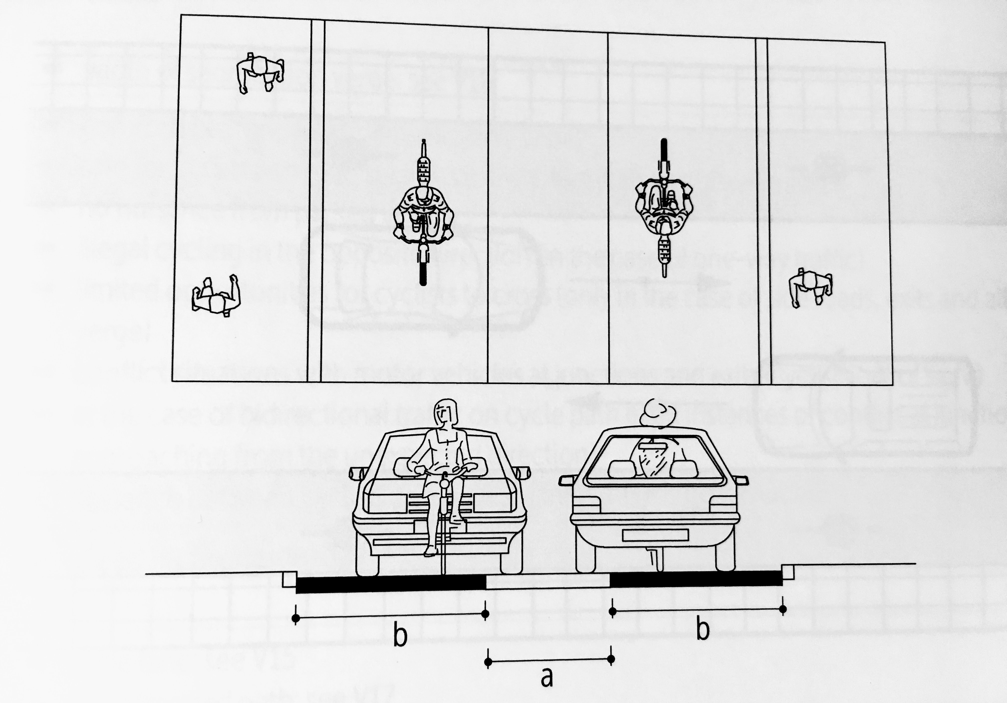 - cyclists at side of roadway (2.0m lanes) with centre border strip (0.8-1.5m)