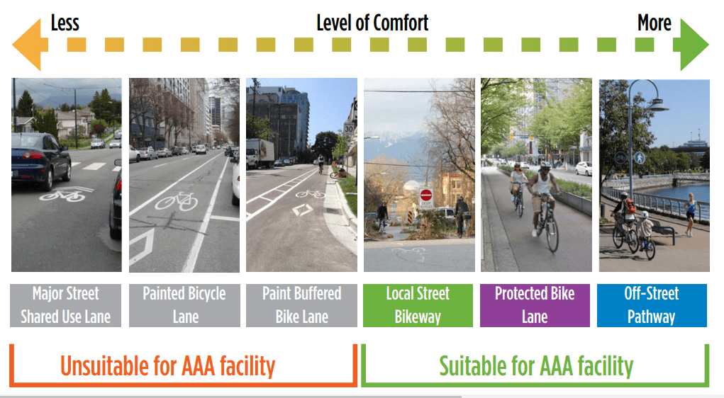 These gains are being achieved on many fronts, one of which is with the creation of its “All Ages and Abilities” (AAA) cycling network. Cycling facilities that are part of this network must meet strict criteria to ensure they are safe and comfortable enough for just about everyone to use. Specifically, this network is made of just three facility types: protected bike lanes, off-street pathways, and local street bikeways.