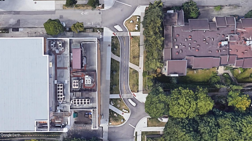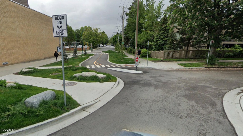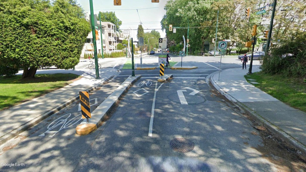Two views of a unique traffic diverter installed at E 10th Avenue and Prince Edward Street as part of the route’s upgrade to a AAA facility. The route bends here, and vehicle volumes exceeded the maximum, so the decision was made to close a block of Prince Edward to vehicles. Source: Google Maps