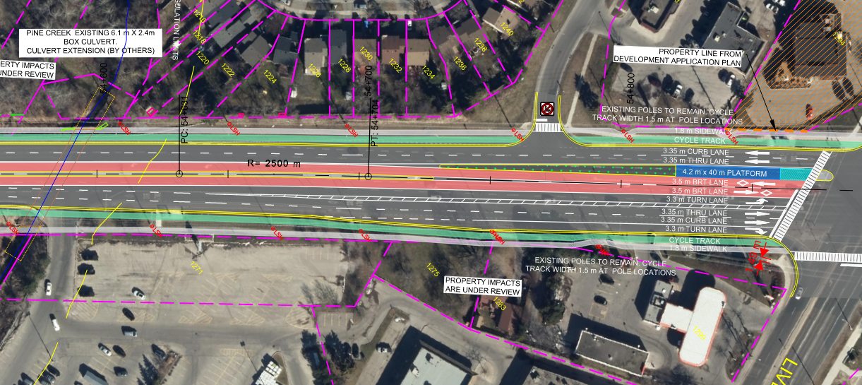 At intersections, even though a very generous amount of property is available, the cycle tracks cross adjacent to the vehicle lanes. I hope that as this design develops and Ontario’s updated cycling design guidance (Book 18) is released that the project team will consider protected intersections with setback bicycle crossings, something that has become a standard in Ottawa.