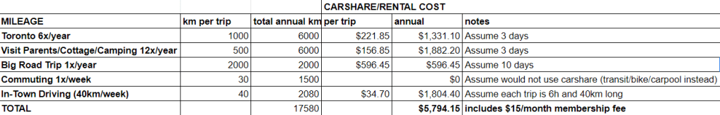 First, I estimated how many kilometres my wife and I drive in a typical year and calculated the cost of taking those trips with a combination of car-share and car rentals, as we have done for the past year.