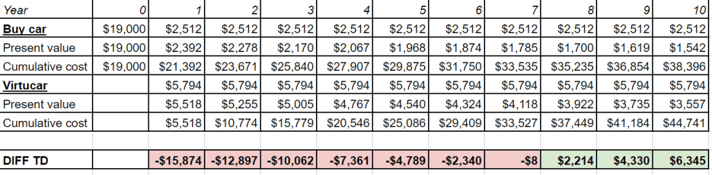 With all this information, I can analyze the situation as an investor would, laying out the cash flow for future years to find where the “break even” point where the purchase of a car pays itself back in annual savings.