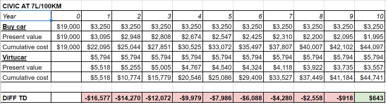 For fun, I decided to use my model to run some sensitivity tests. First, the fairly realistic scenario of buying a Honda Civic instead for the same purchase price (remember, $750 more a year in gas)