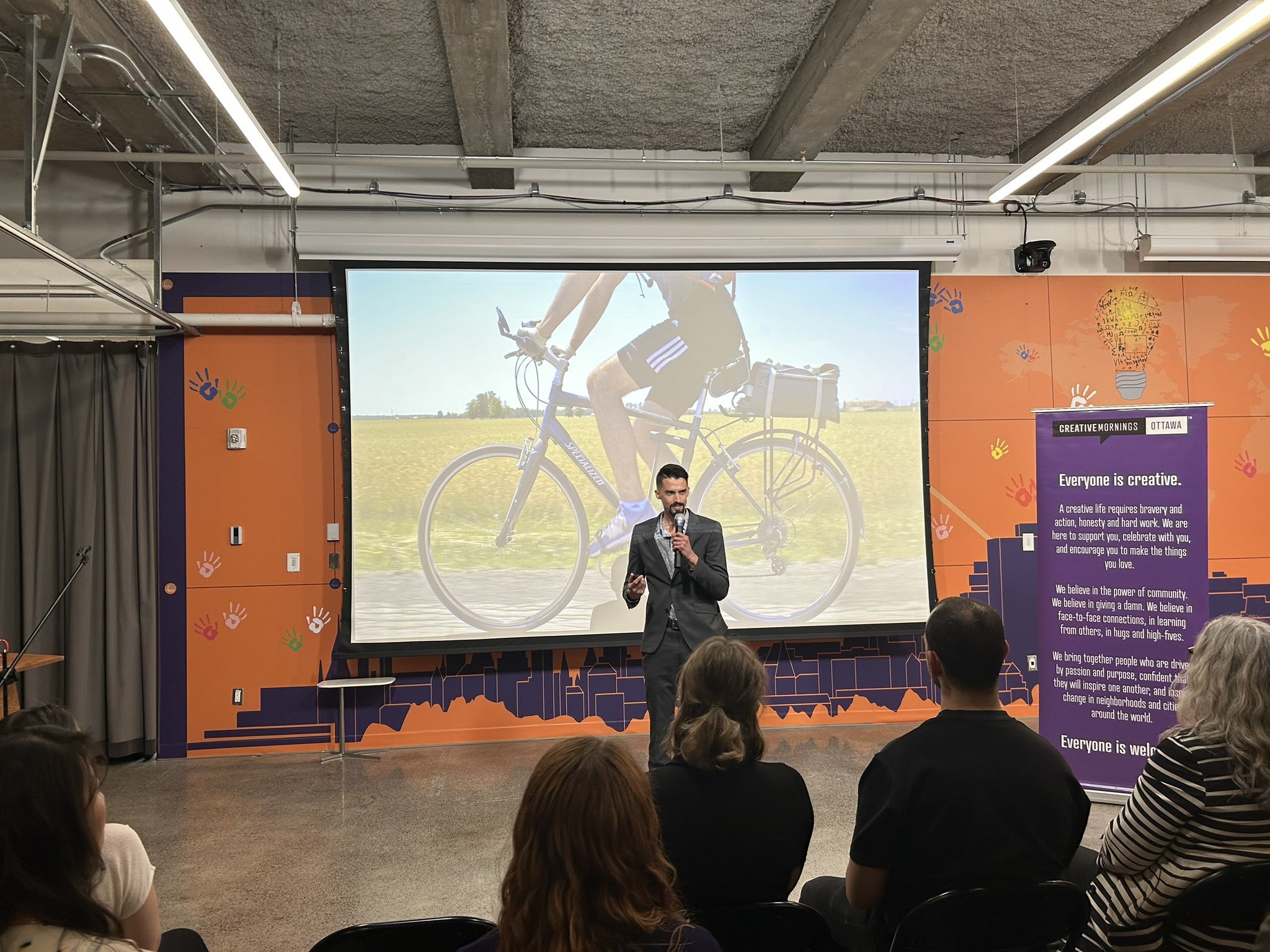 When you build a city for cycling, everyone benefits. This was the central idea of a talk I shared recently at CreativeMornings Ottawa, to an audience of about 120 people. I shared how I became interested in cycling and its benefits for cities, how I discovered the cycling city of Amsterdam, and how this led me to focus my career on translating Dutch transportation design practices over to Canada. I then shared four points of why I think Ottawa is on the cusp of becoming a cycling city (culture, innovation, politics, future), and three things we still need to do more of to get there (build walkable places, experiment more, deprioritize cars). Finally, I left the audience with some homework: support walkable development in your neighbourhood, reimagine your community, and support cycling infrastructure (even if you’re not a cyclist).