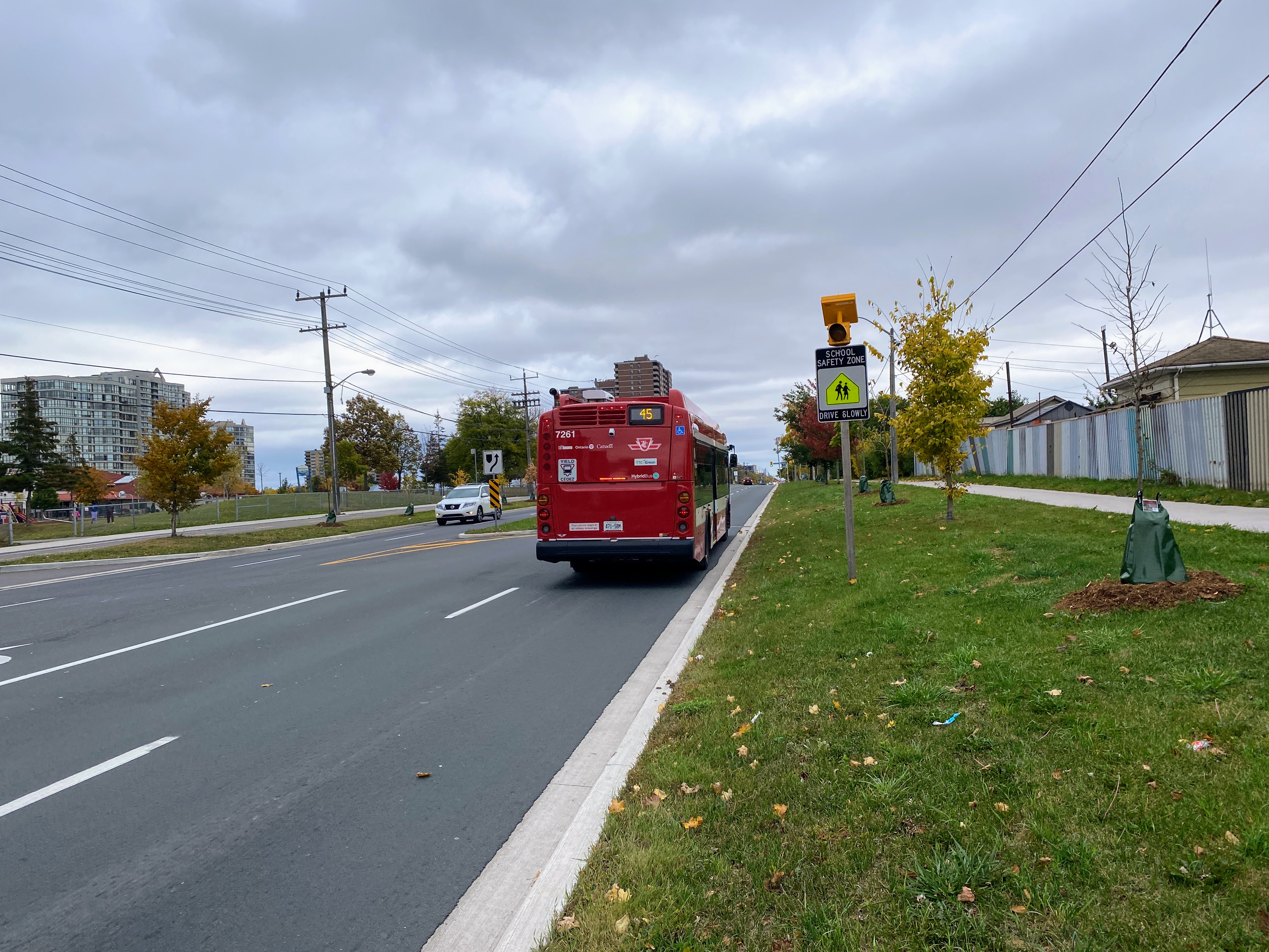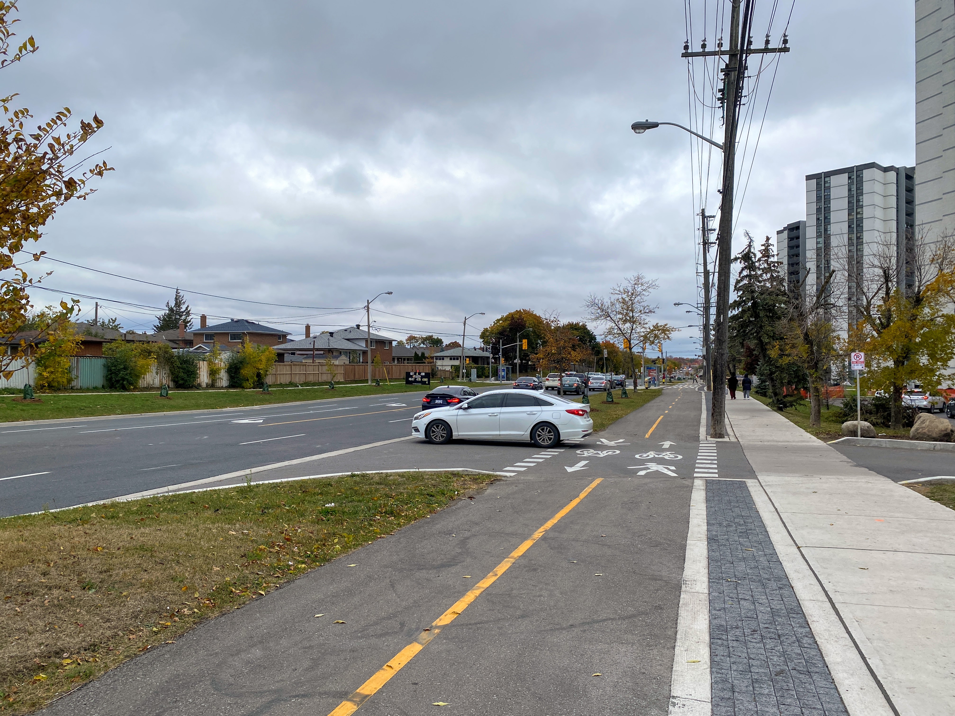 Despite being a main thoroughfare for cars, the road is hospitable for pedestrians and cyclists. Toronto standard 2.1 m (7 ft) sidewalks are provided on each side of the road, and a wide two-way multi-use trail is provided on the side with the apartment towers. The trail is set back from the roadway enough that turning vehicles actually have space to queue without blocking lanes, a notable benefit of setback crossings. This setback area also doubles as a wide space for trees and a large platform at bus stops.