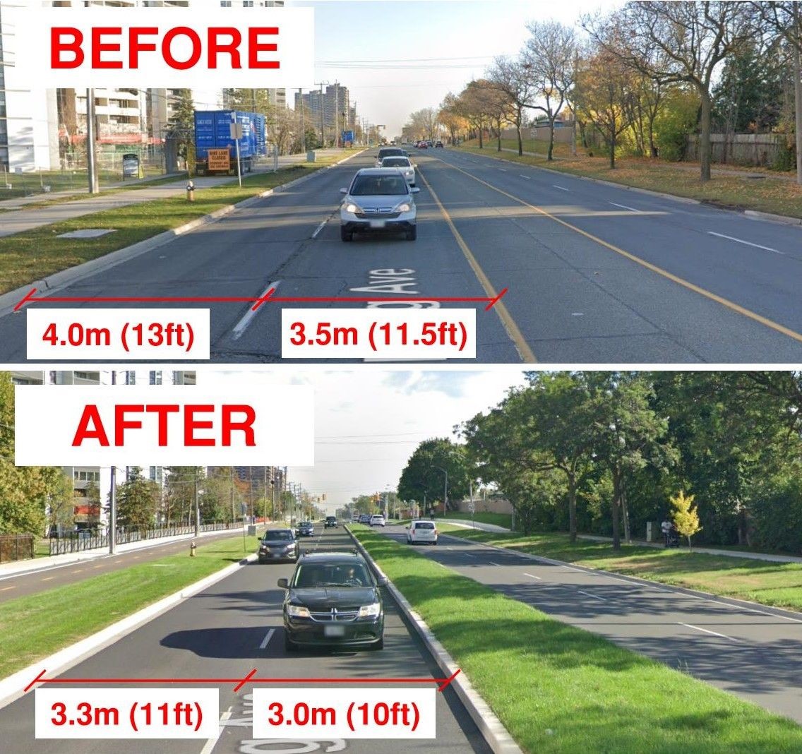 While there is much research that narrow lanes are an effective speed control measure without compromising safety, few municipalities build them this narrow. Toronto, on the other hand, has its own lane width design guidelines that specifically prescribe these lane widths.
